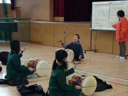 3時間目は6年生が、講師の先生に韓国・朝鮮の「チャンゴ」という楽器の演奏の仕方を教えていただきました。