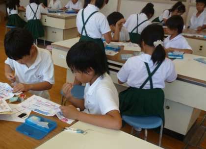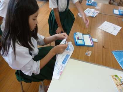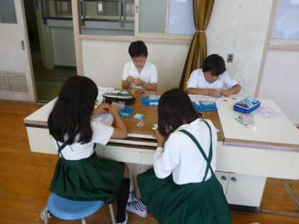 今日は、5年2組の人が「名前のぬいとり」と「ボタンつけ」をしました。