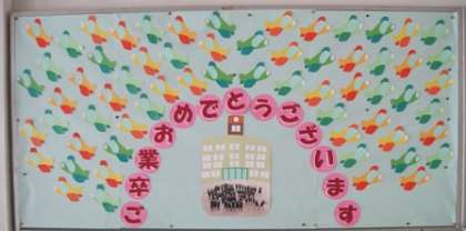 玄関掲示が変わりました。大空に飛び立つ63機の飛行機。6年生の卒業を祝った掲示になっています。