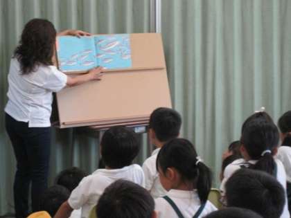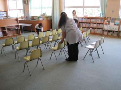 写真(上)子どもたちがお話を聞きやすいように図書室の机、いすを並べ変えているところ。毎回動かしていただいています。
