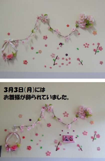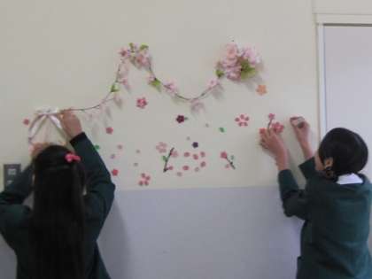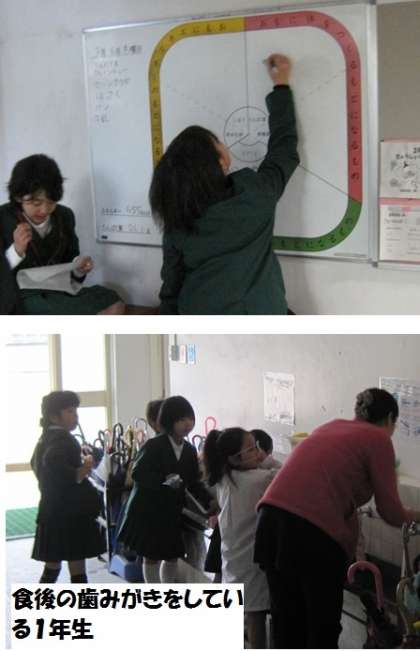 食器を返却にくる学級を待っている給食委員会の児童が、お花のレイアウトを変えていました。また、栄養黒板のところでは、委員会の児童が明日のこんだてを書き込んでいました。