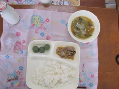 今日の給食では、よもぎだんごにきな粉をかけて食べました。