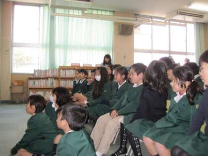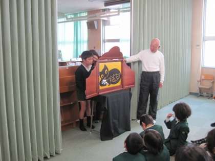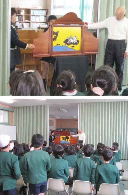 今日のお話の会は、読み聞かせの方に協力いただいて3年生の児童が紙芝居を読みました。