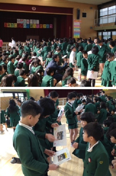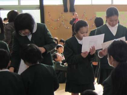 似顔絵ゲームの後は、在校生が卒業する6年生に向けて書いた寄せ書きのプレゼントを渡しました。