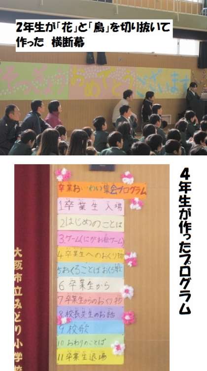 4年生は、児童用プログラム(印刷したもの)と舞台横に掲示されているプログラムを作りました。3年生は校舎内飾られた「卒業お祝い集会」のポスターを作りました。(後ほどアップします)