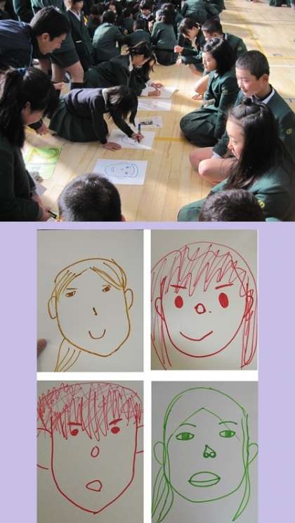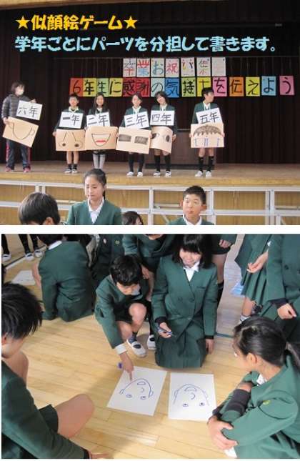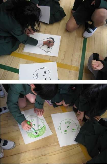 マジックをバトン代わりに6年生が輪郭を描いた紙に、目、鼻、口などを書き加えていきます。みんなニコニコしながら似顔絵を描いていました。