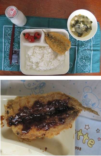 いわしは、刺身、塩焼き、フライ、天ぷら、酢の物、煮付けなどにして食べられます。稚魚や幼魚はちりめんじゃこ(しらす干し)、釜あげ(釜あげしらす)や煮干しの材料になります。今日の給食では「フライ」にして出ています。