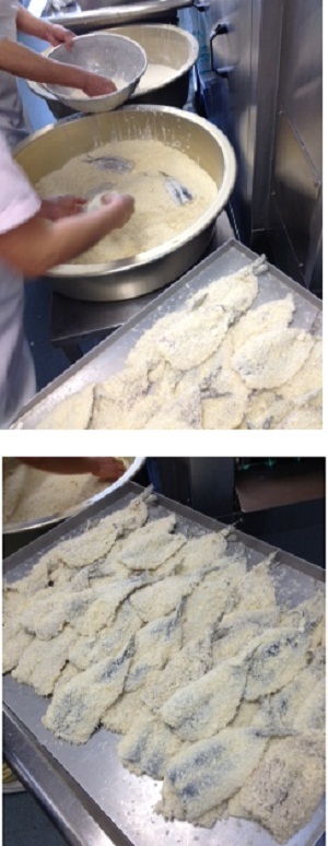 給食のいわしフライは1つ1つ給食調理員さんが衣をつけています。