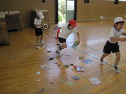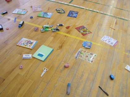 床にバラバラとノートや鉛筆がちらばってます。