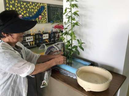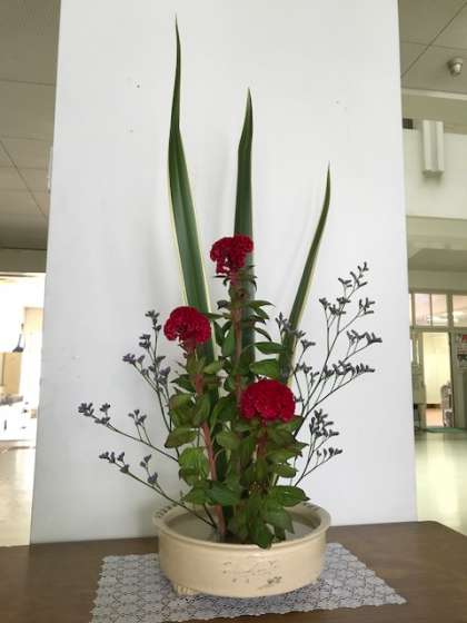 先日の夕方、ボランティアさんにお目にかかれました。2週間に一度程度のペースで花を生けてくださっているそうです。今回は、花器も花に合わせて替えてくださいました。