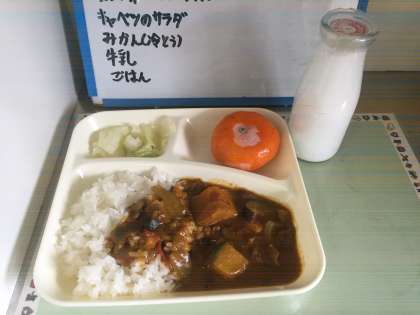 今日の献立:夏野菜のカレーライス、キャベツのサラダ、みかん(冷凍)、牛乳