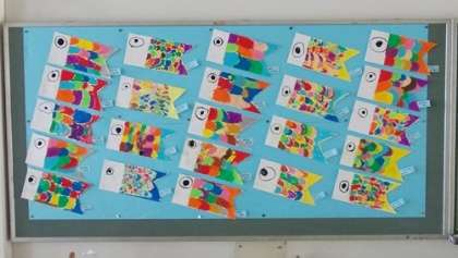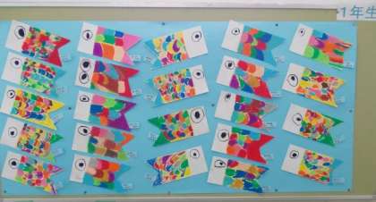 1年生が作った カラフルでかわいいこいのぼりが元気に泳いでいます