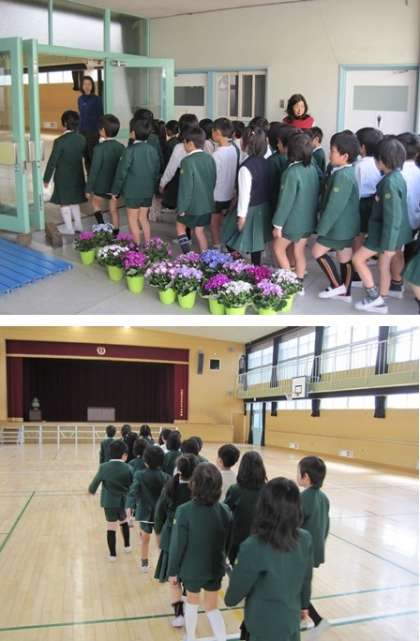 お祝いの言葉の中で、「校歌」や「お弁当箱の歌」や「さんぽ」を手話やかわいらしい身振りをつけながら歌っていました。