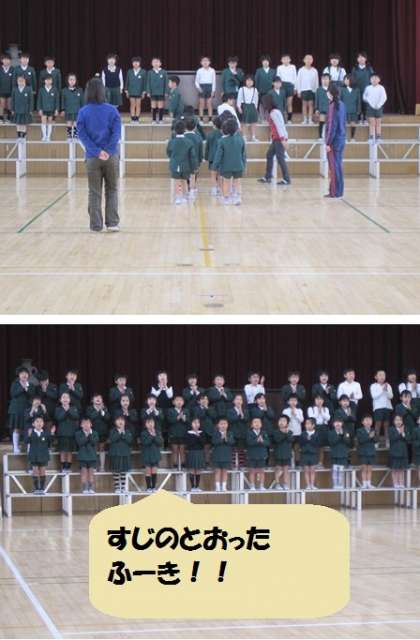 入場行進曲に合わせて、しっかり手をふって元気に入場し、元気いっぱい大きな声でお祝いの言葉を言っていました。