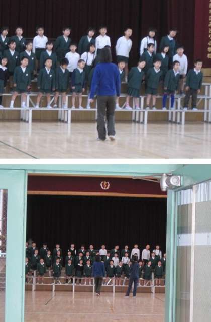 1年生が講堂で入学式のときにする「お祝いの言葉」の練習をしていました。