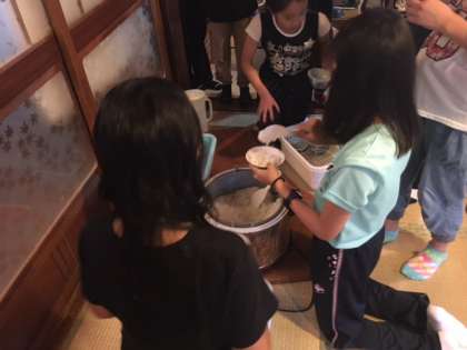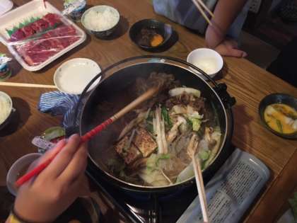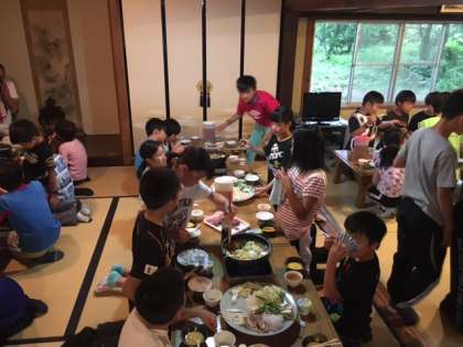 林間初日の夕食はすき焼きです。食事係が全員の準備を頑張ってくれました。「いただきます」の掛け声の後、各班で協力してすき焼きを作り、美味しくいただきました。