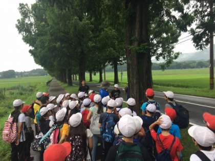 宿舎付近には田園風景が広がりお米と水のお話や山々の自然のお話を聞きながら散策しました。また、メタセコイア並木を見ながら木のお話も聞くことができました。学校に戻ってから今日聞いた話を思い出して、鶴見のメタセコイアを見てほしいと思います。