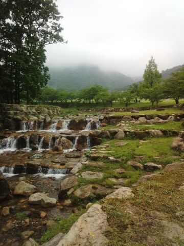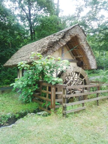山谷の雲霧が陽射しを隠して、灼熱の夏から開放され、気持ちがいいです。水車小屋がマキノの自然と融和しています。蝉の声が大阪より優しく感じます。
