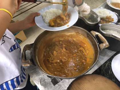 グループで役割分担し、カレー作りを頑張りました。野菜の皮を剥いたり、切ったりしました。飯ごうは上手にできたところや焦げたところがありましたが、グループで協力して作ることができました。