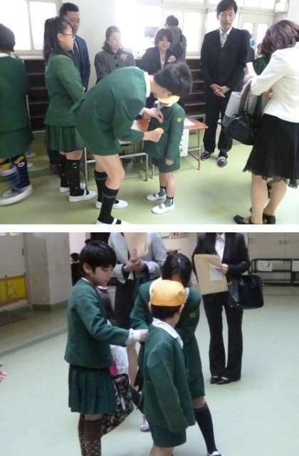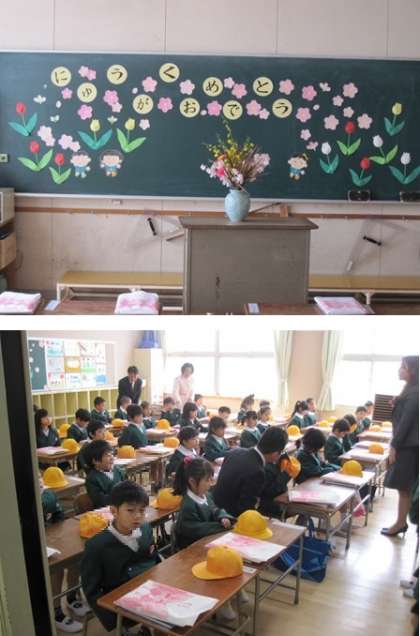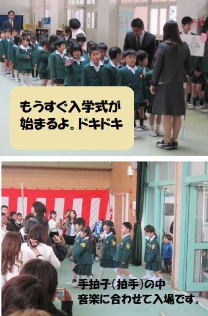 教室前受付で、お手伝いのために登校していた6年生の児童から名札を付けてもらい、6年生と一緒に靴を靴箱に入れたあと、教室に入って入学式を待ちました。