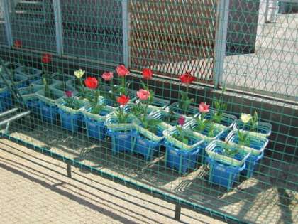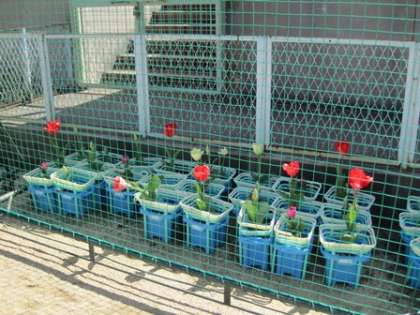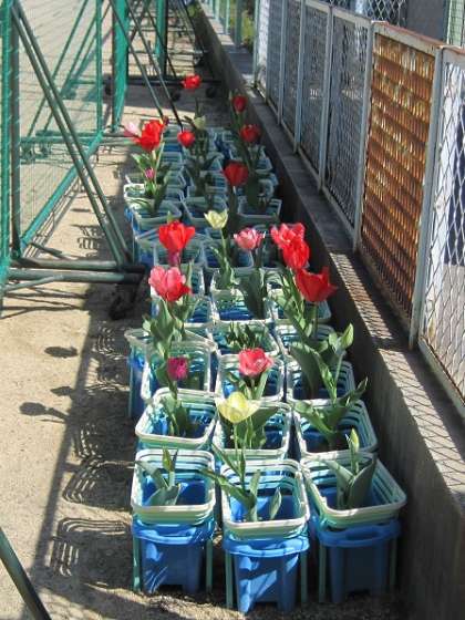 プール横の学習園の近くで、2年生が1年生の秋に植えたチューリップが成長し、きれいな花を咲かせはじめています。