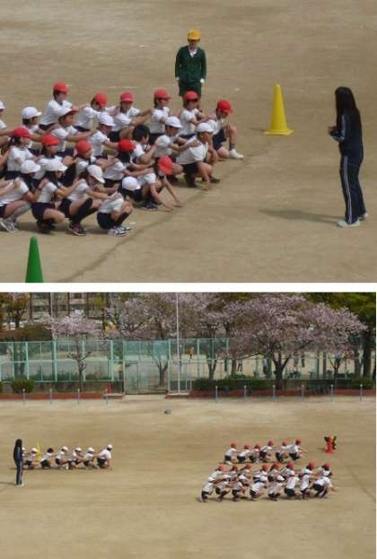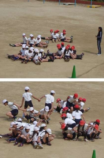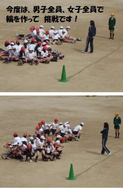 体育で体作りの運動をしていました。写真はグループで協力してお互いの力を上手に利用して立ち上がります。最初は7〜8にんずつのグループで、慣れてきたら男女別に1つの円を作って立ち上がる競争をしていました。