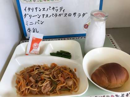 今日の献立:イタリアンスパゲッティ、グリーンアスパラガスのサラダ[ノンエッグドレッシング]、黒糖パン(小)、牛乳