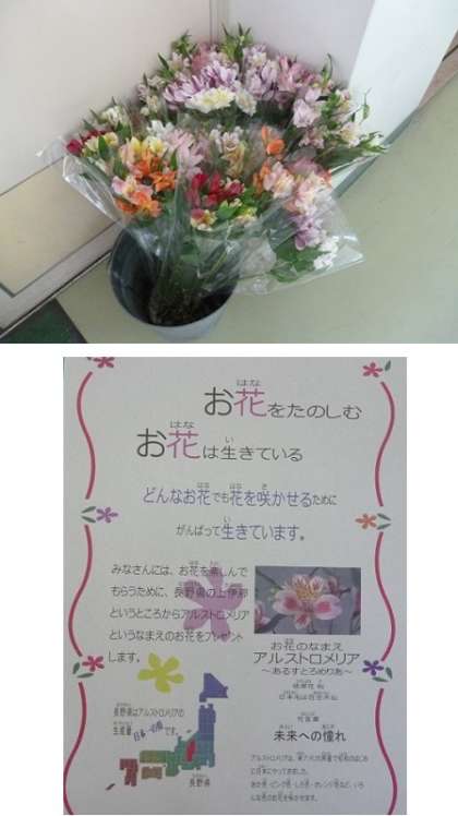 「アルストロメリア」という種類で彼岸花科の花です。(彼岸花というのはごんぎつねで出てきますね)花言葉は「みらいへの憧れ」です。