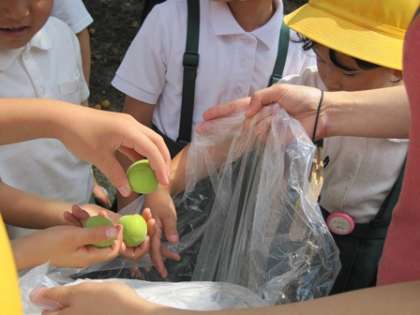 2年生が講堂の入り口に実っている梅の実を収穫しました。