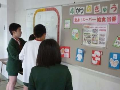 給食委員会の児童が、みんなでなかよく栄養黒板に明日の献立を書いていました。