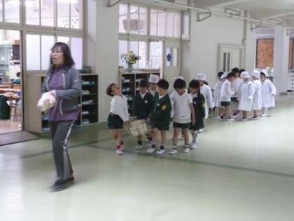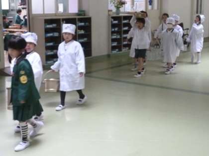 その後、給食を食べ終わった1年生が食缶を並んで返しに行ってました。