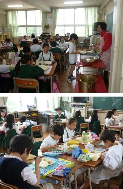 写真 下、3年生の給食風景です