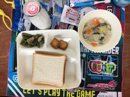 今日の献立:はくさいのクリーム煮、あつあげのしょうゆだれかけ、豚肉と三度豆のいためもの、食パン、イチゴジャム、牛乳