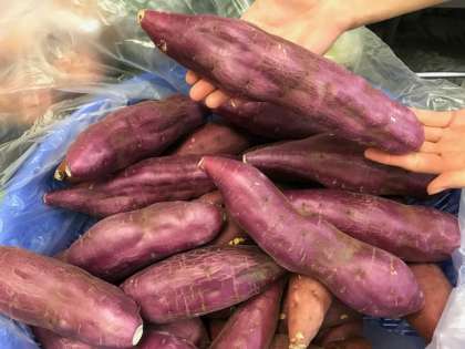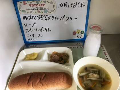 今日の献立:豚肉と野菜のケチャップソテー、スープ、スイートポテト、ライ麦パン、牛乳