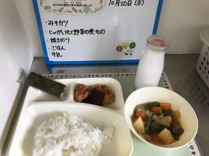 今日の献立:みそカツ、じゃがいもと野菜の煮もの、焼きのり、ごはん、牛乳