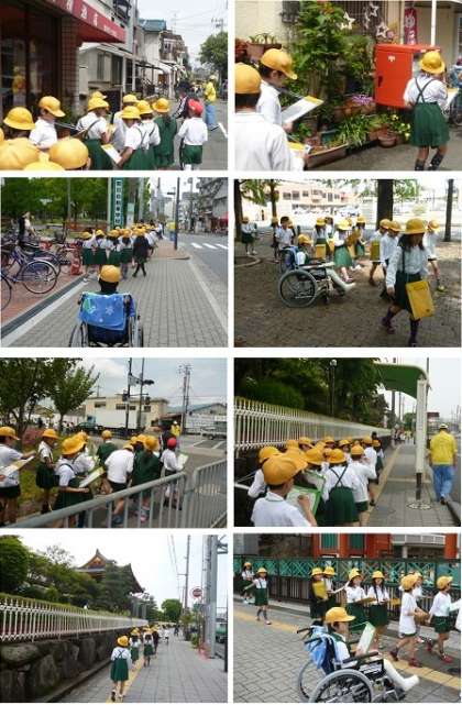 先頭の先生は、つねに今どちらの方角に向かって歩いているかカードを掲げながら歩いていたのですが、地図をまだ上手に活用することができない児童がたくさんいました。