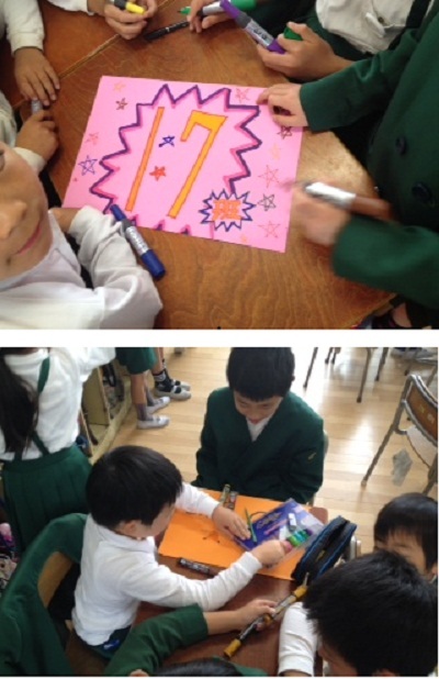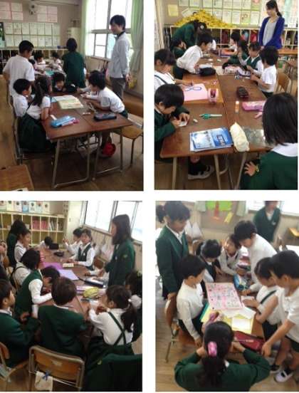 まず、お互いに自己紹介をした後、6年生が中心になってたてわり班の旗を作りました。