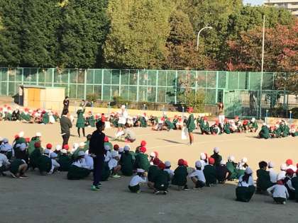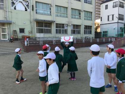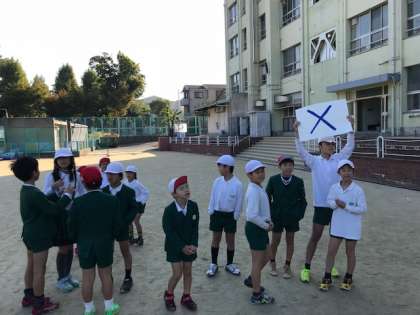 好天のもと運動場で児童集会がありました。本日は、○×クイズでした。