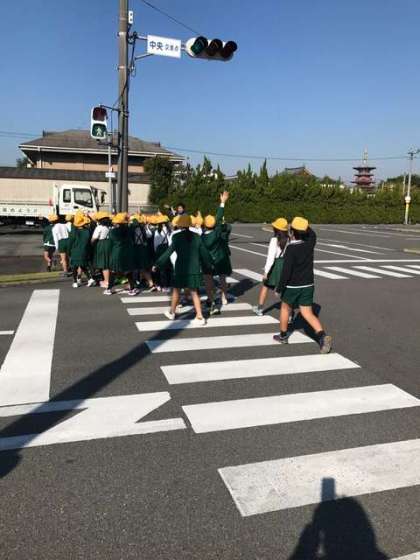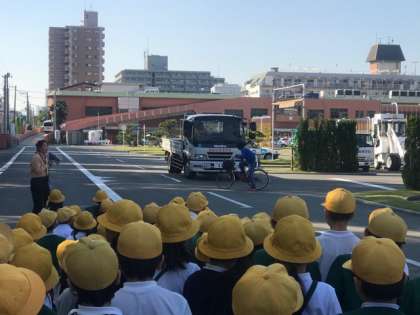 今日は午後から、関目自動車教習所で、交通安全指導がありました。遠くからよく目立つ色について、横断歩道の安全な歩行の仕方、バスから歩行者の見え方など、交通安全について学びました。