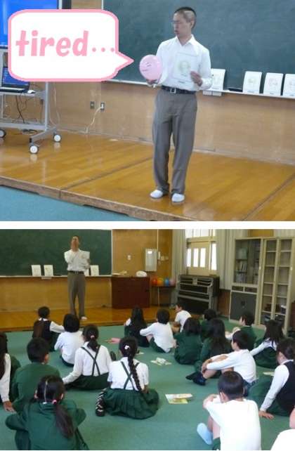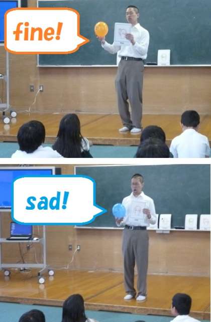 その後、「シャキーン!!」とマジックを取り出して、風船に表情を書き込んで、その風船を見ながら気持ちを表す英語の言葉を練習しました。