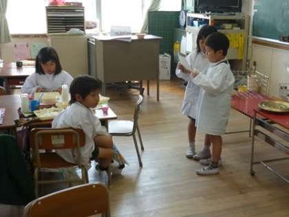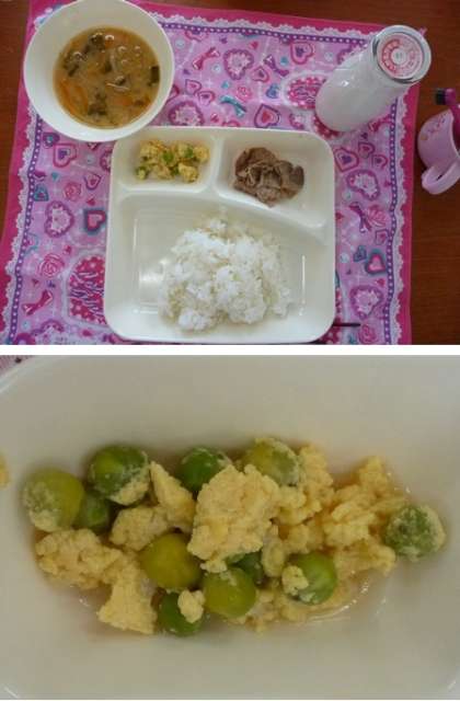えんどうは、秋に種をまき、春に豆を実らせるので、3月から6月ごろによくとれます。えんどうは、さやから豆を取り出して食べます。今日の給食では、えんどうの卵とじに使われています。