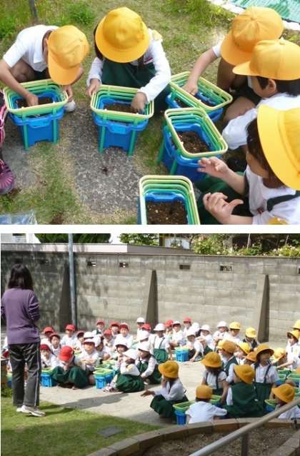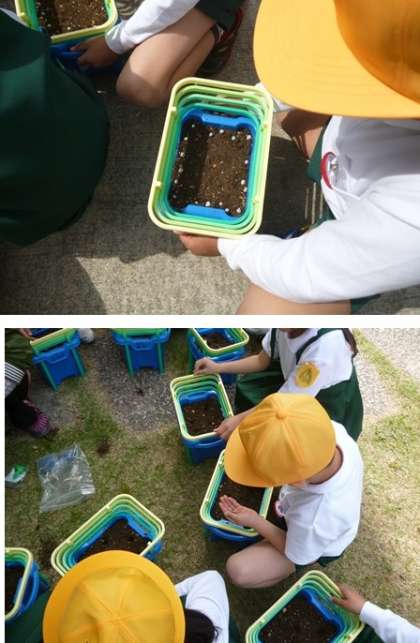 みんなが植え終わったあと、管理作業員さんにお礼を言ってから、プールのそばの学習園まで、がんばって植木鉢を運びました。早くふたばが出て、大きく育ってくれるといいですね。