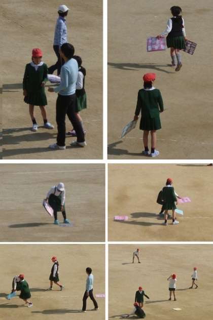 委員会の当番の児童は、運動場にみんなが集まりやすいように、先日作成した班の旗を運動場に並べていました。