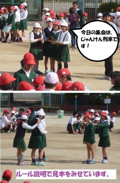 今日の集会は、たてわり班で集まって運動場でする初めての集会でした。