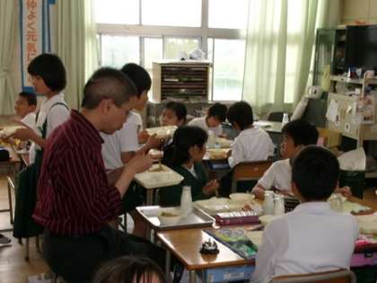 写真(下)C−NETのエディー先生が4年1組のみんなと一緒に給食を食べました。