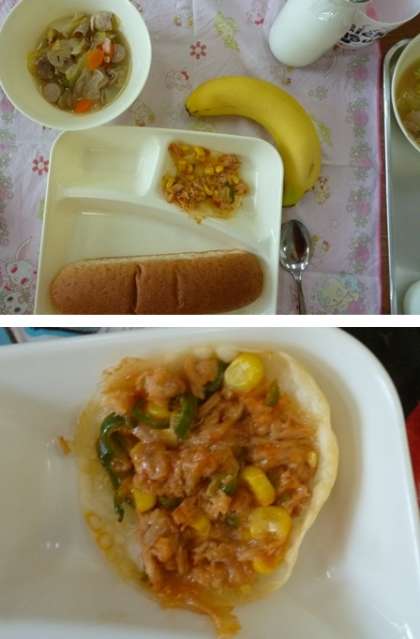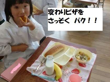 今日の給食では、「変わりピザ」が出ていました。ギョウザの皮を利用して作られています。