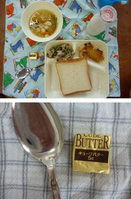 ※今日の給食では、パンの添加物にバターがついていました。(バターは、今年からつくようになりました。)
