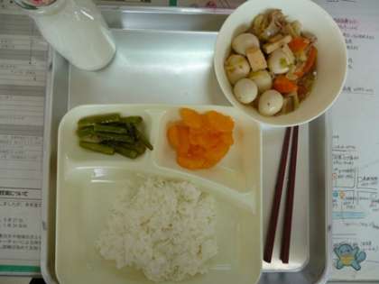 今日の給食では、豚肉、いか、うずら卵、たまねぎ、キャベツ、たけのこ、にんじん、ピーマン、しいたけの9つの材料が入っています。