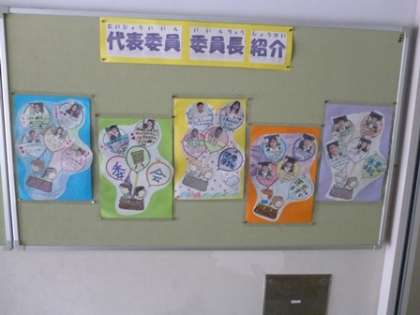 1階、放送室横の掲示板(中央階段そば、1年生のくつばこ近くです)に、代表委員と各委員会の委員長を紹介する掲示物がはられています。代表委員、委員長の紹介文が書かれていますので良かったらお読みくださいね。