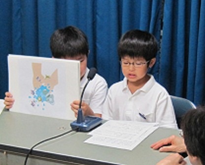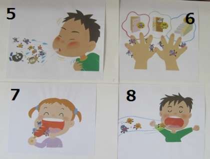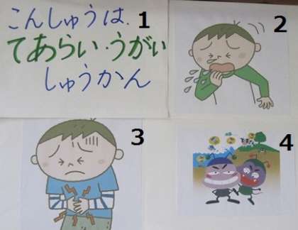 保健委員会の児童が、手洗いうがいを啓発する紙芝居をテレビ朝会の時に放送しました。